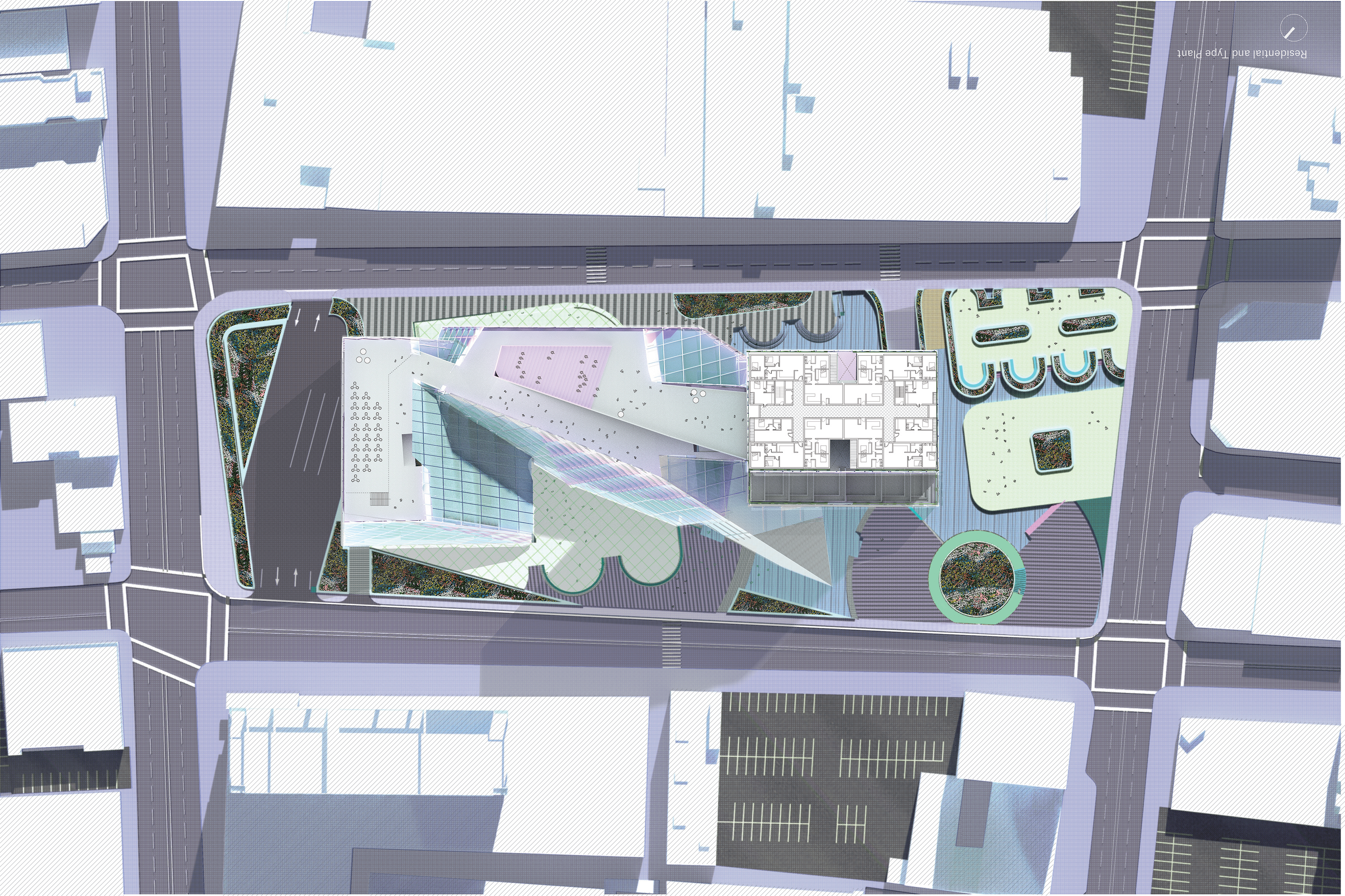 Our architectural proposal embraces formal ambiguity both in terms of our tectonic approach as well its massing strategy. The Simple platonic shapes are positioned in a way that makes them be perceived as dislocated and unstable, yet the linearity of the form and directionality reinforces its stiffness and platonic formality. The use of various reflective, refractive, opaque and shiny materials, like colorations of glass and steel, and iridescent and dichroic glass broadens the ambiguity of the acute geometry deceiving the senses and tricking the user and its reading of the architectural project. This project presents new interpretations and multiple architectural manifestations by embracing optical effects in its composition, which are able to generate different readings through the different views along the architectonic project